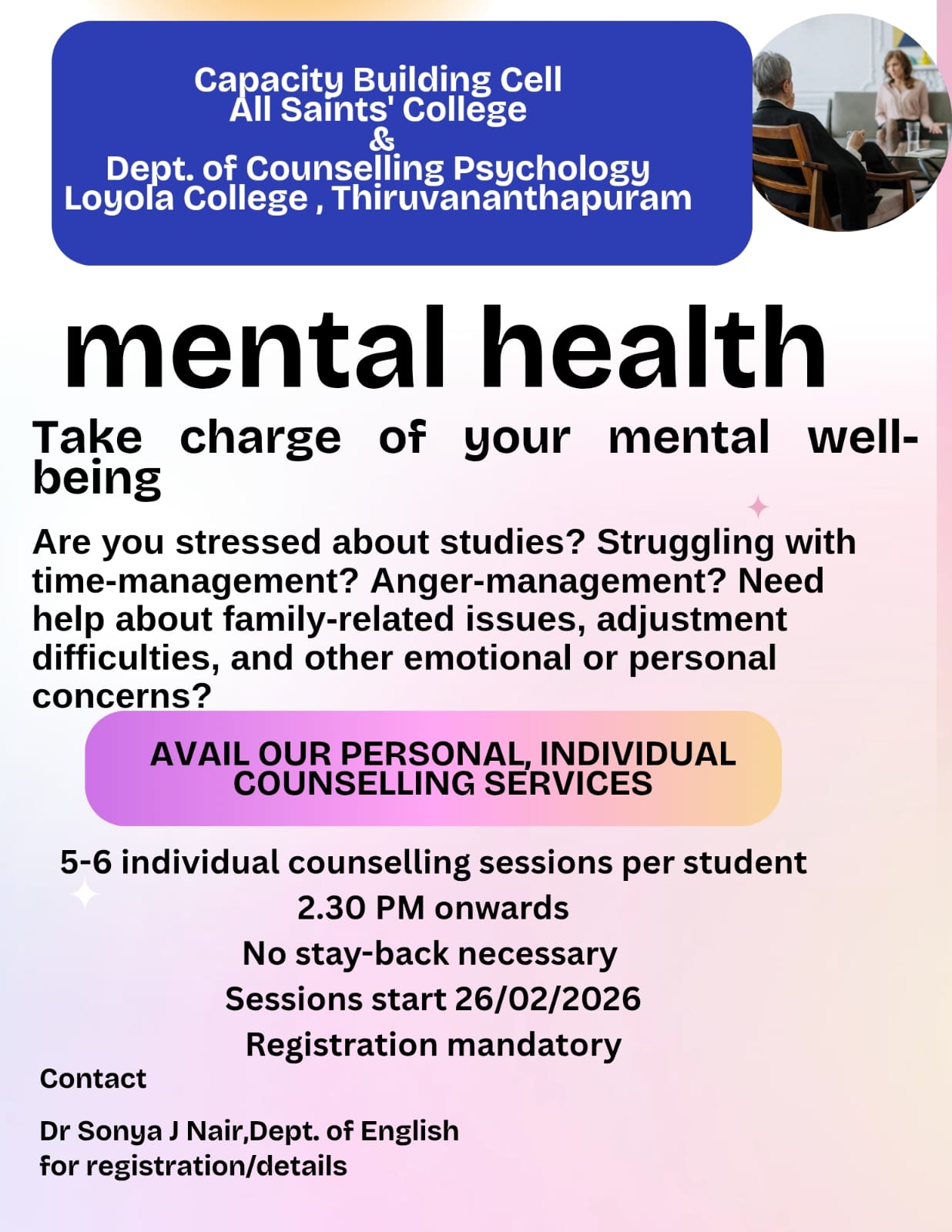 Capacity Building Cell All Saints' College & Dept of Counselling Psychology, Loyola College Organises "Mental Health: Avail our Personal Individual Counselling Services "