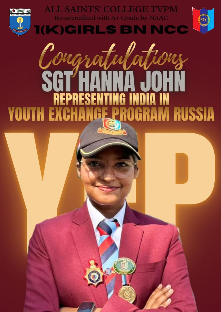CONGRATUALTIONS SGT Hanna John for representing India in Youth Exchange Programme Russia